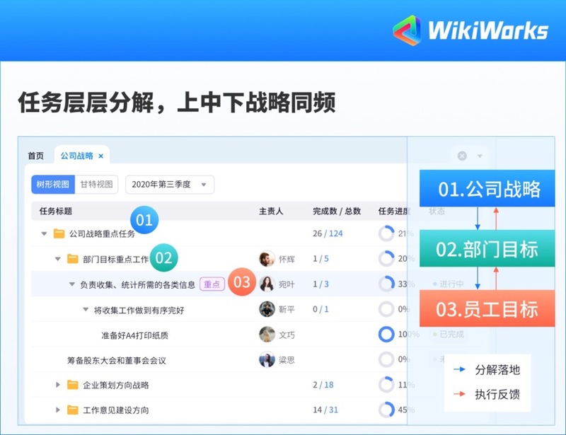 了解任务WikiWorks中的任务来源于公司高层制定的公司年度经营计划,将年度经营计划按照公司-部门-个人任务的顺序分解,直至分解为可执行的最小单位。