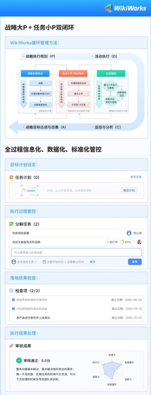 关于流程规范,WikiWorks融入了PDCA循环方法,从目标计划设定、执行过程管控、落地效果检查以及执行结果审核,真正实现了全过程信息化、数据化、标准化管控,战略得以自上而下快速有效地落地执行。