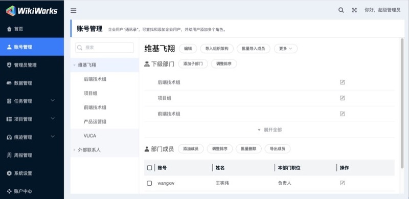 为了方便企业成员管理,WikiWorks提供了「导入组织架构」、「批量导入成员」、「企业成员管理」等管理功能。