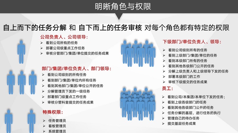 2. 领导同样包括公司、部门、科室乃至小组的管理人员,重点负责分解上级负责人和上级领导下发的任务,部署该层级部门的工作,同时审核夏季提交的任务成果;