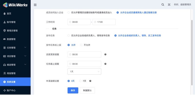 特别说明:如果系统管理员在系统后台中的「系统设置」-「发布任务」处做了“仅允许企业各组织负责人、领导发布任务”的设置,那么,员工角色的企业成员则只能享有所属参与任务的执行,管理自己的待办任务,提交相应的任务成果。