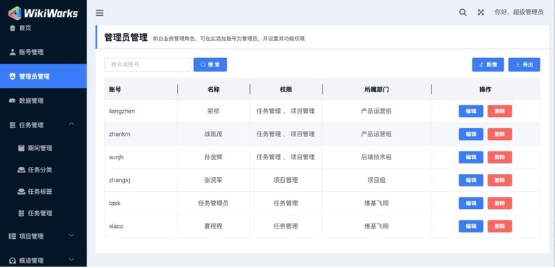 对管理员账号,可做“编辑”“删除”“导出”及“导出”操作。