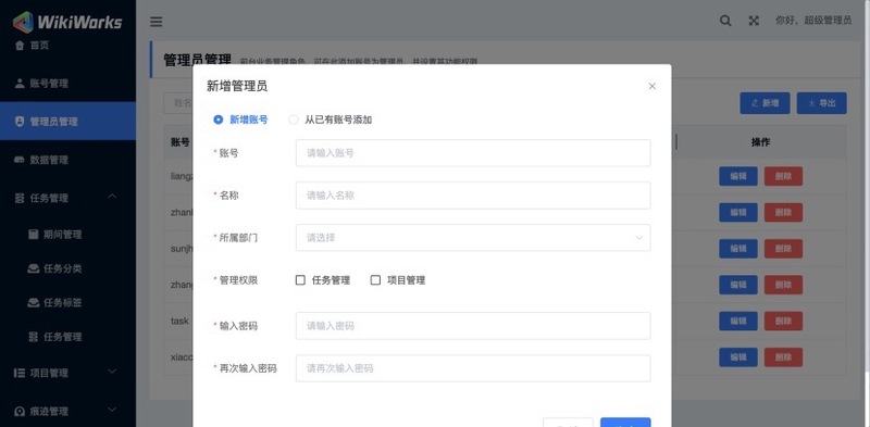 部门任务管理享有管理本组织内部任务以及本组织任务的发布/批量发布、删除、修改及统计分析的权限,需要系统管理员在系统后台「管理员管理」中进行设置,如图所示: