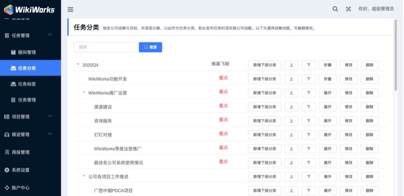 了解任务WikiWorks中的任务来源于公司高层制定的公司年度经营计划,将年度经营计划按照公司-部门-个人任务的顺序分解,直至分解为可执行的最小单位。