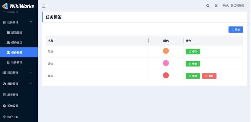 系统「任务管理」的目标,是在能使工作流量不变复杂的情况下提高任务管理的效率。其中,任务管理可以是对初次使用系统时「任务分类」、「任务标签」的设置,也可以是对过程中任务的修改、删除、搜索和导出以及对每一年度、每一季度的任务实施「期间管理」。