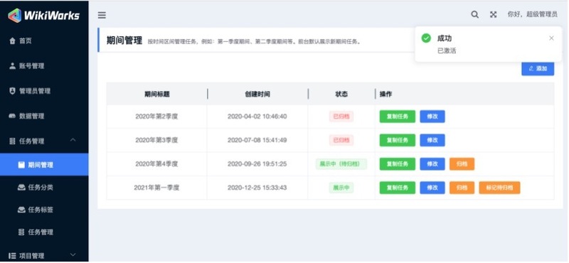 期间创建成功后,期间呈“草稿”状态,未点击“激活”之前,该区间任务将不会在前台展示。