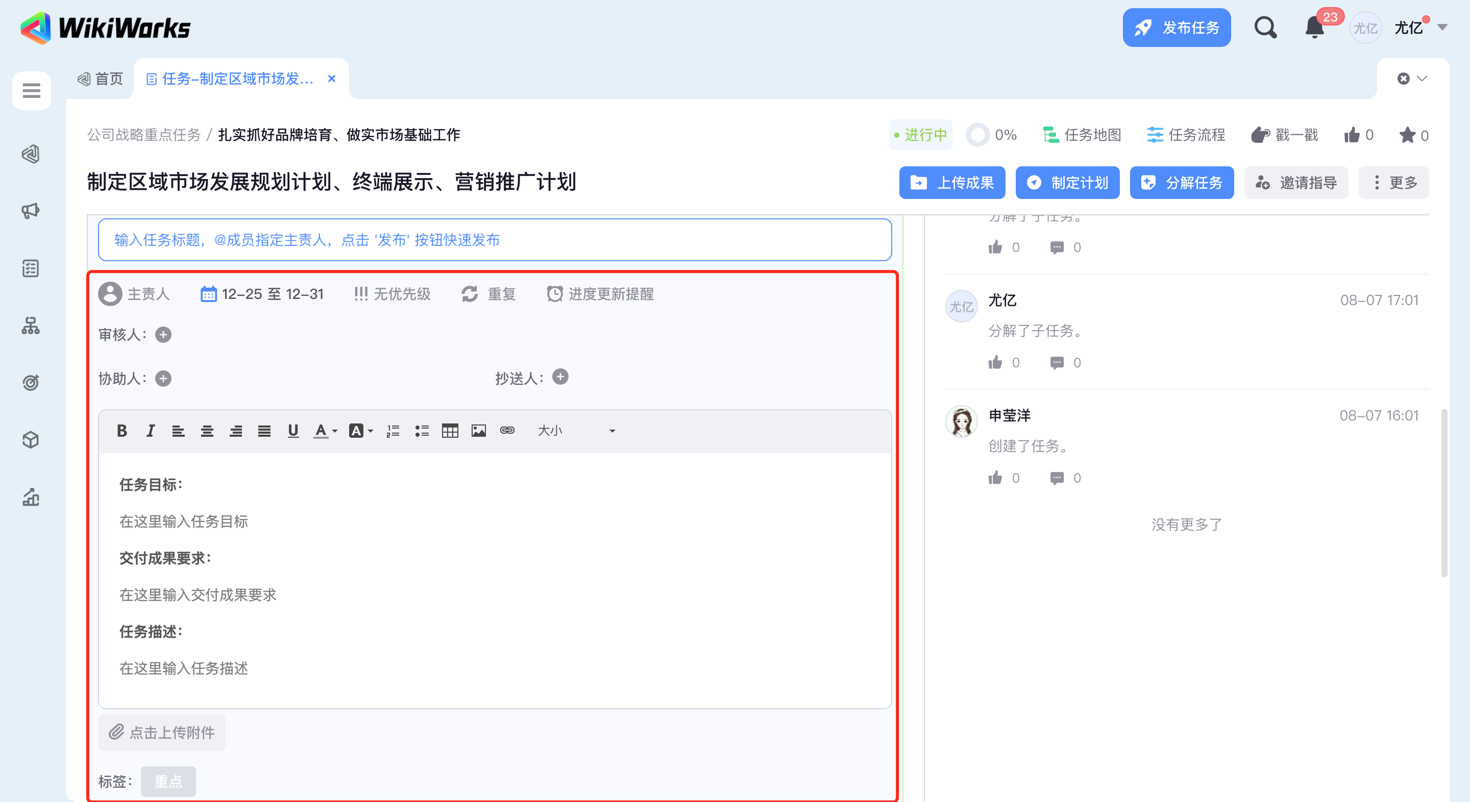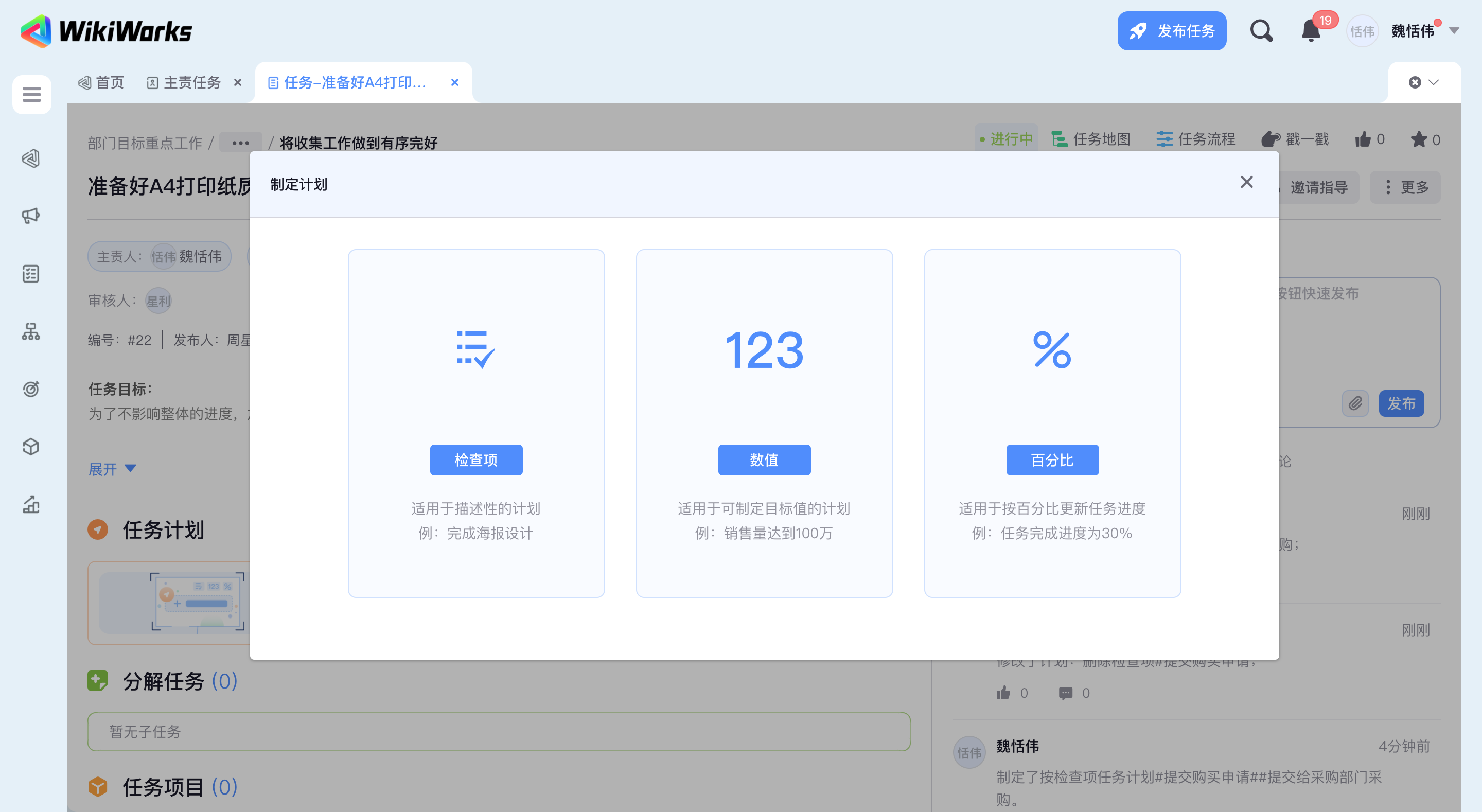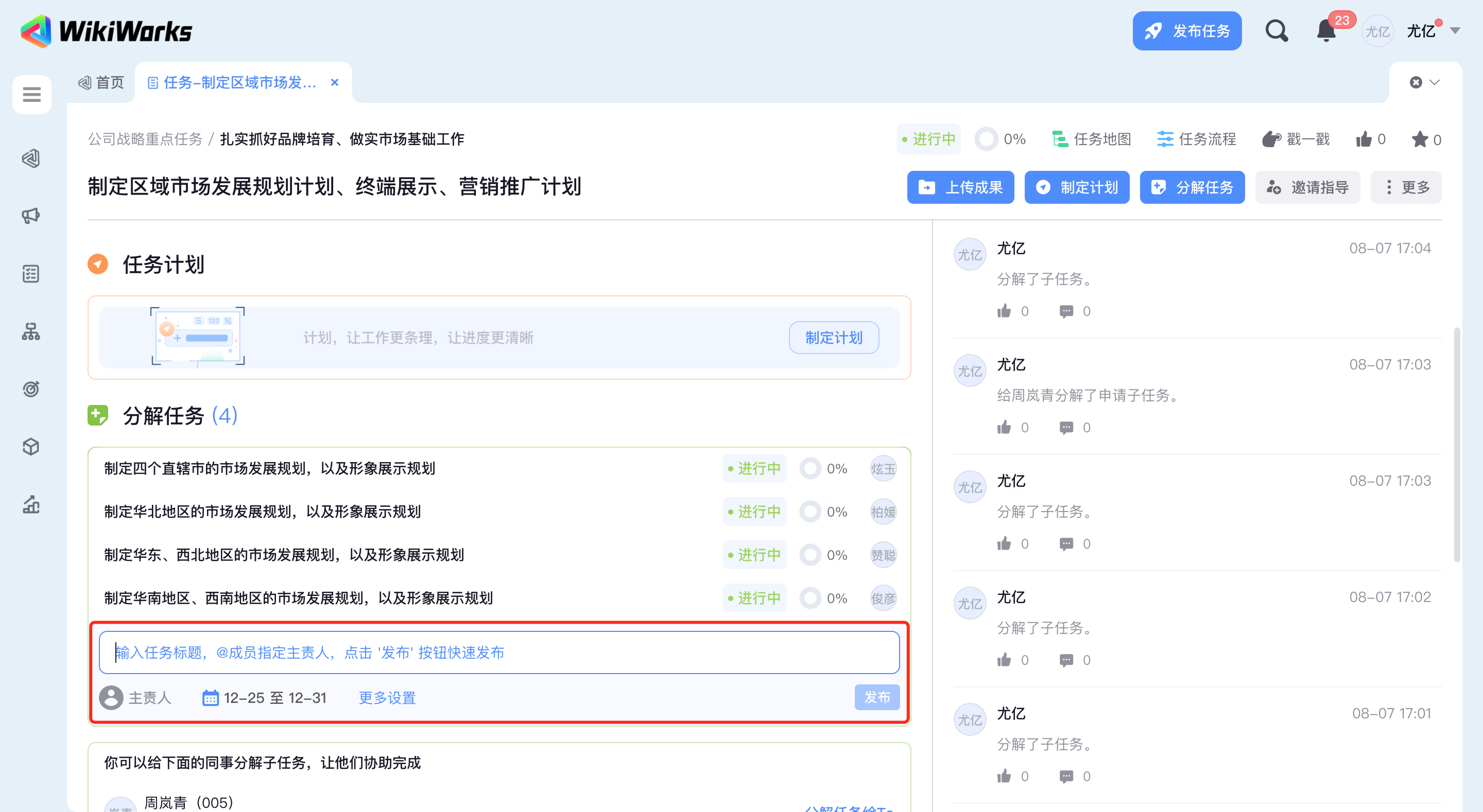 了解任务WikiWorks中的任务来源于公司高层制定的公司年度经营计划,将年度经营计划按照公司-部门-个人任务的顺序分解,直至分解为可执行的最小单位。