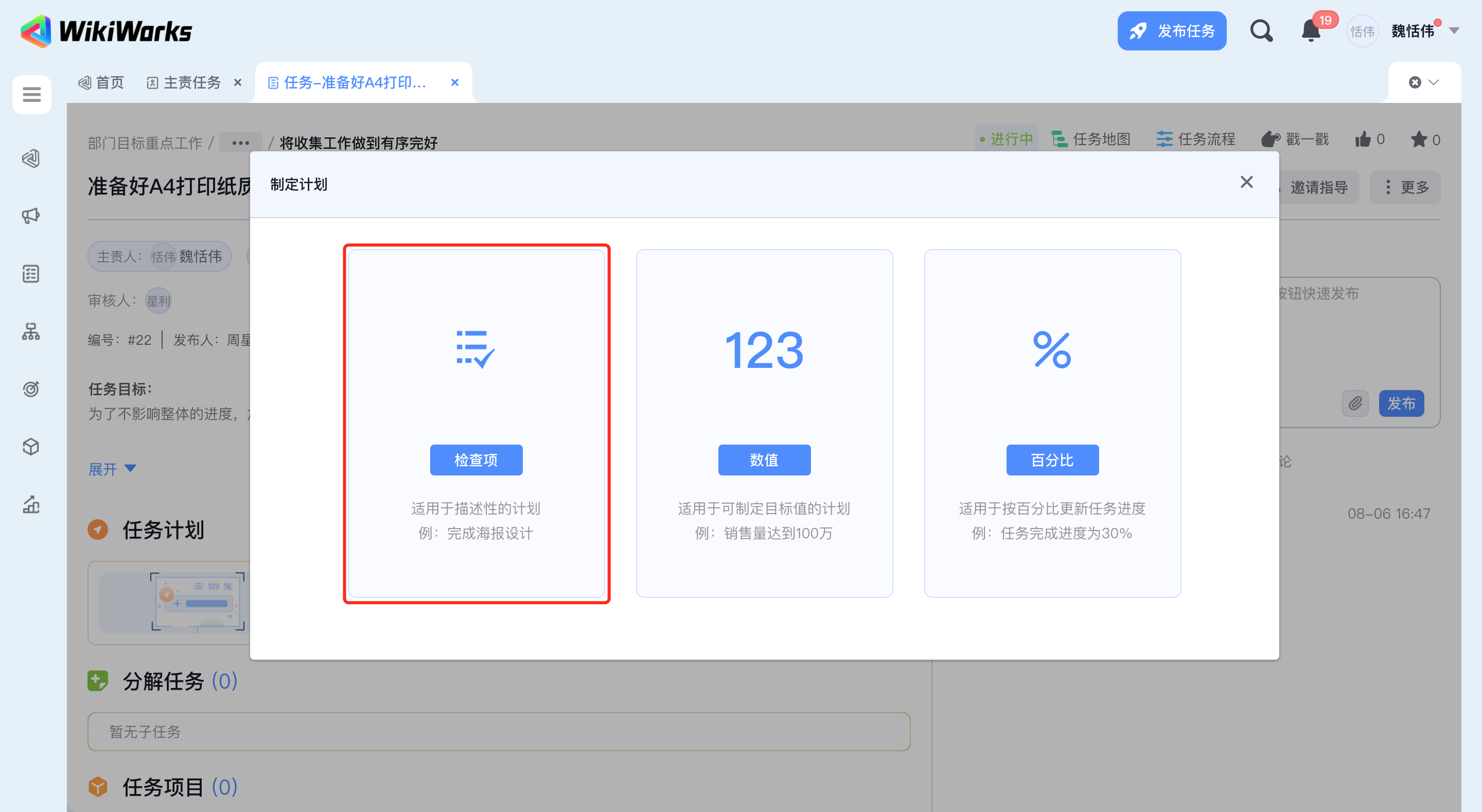 对于任务周期较长、执行细节要求多的任务,可以按「检查项」制定计划。点击「制定成果」,选择检查项,输入成果名称。每输入一个检查项后按下「Enter」键,你就可快速添加下一个检查项。选中某检查项的复选框,该项字体颜色变为灰色,被横线划掉,表示该项已完成,点击「发布」更新成功,该关键结果的完成百分比会随之变化。
