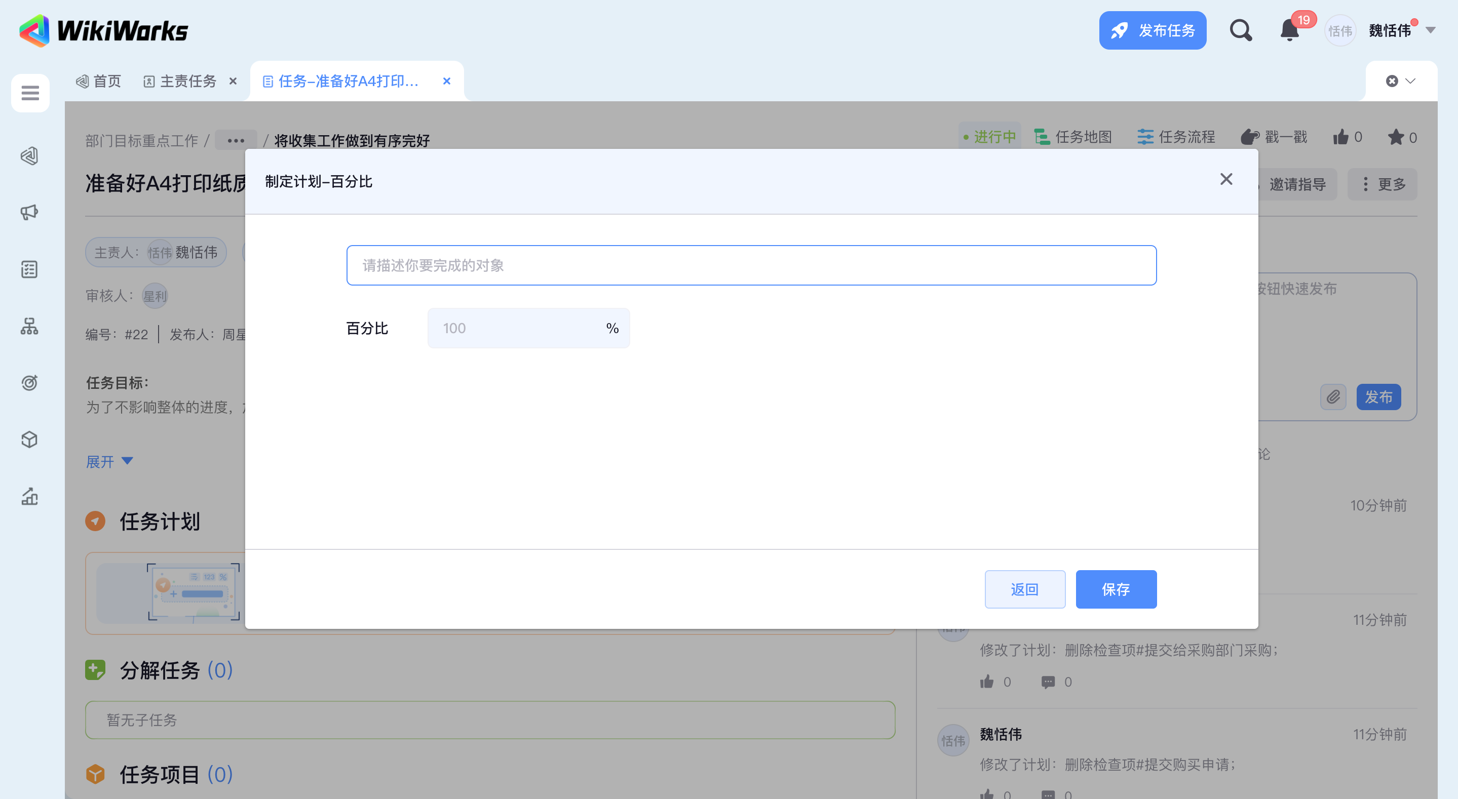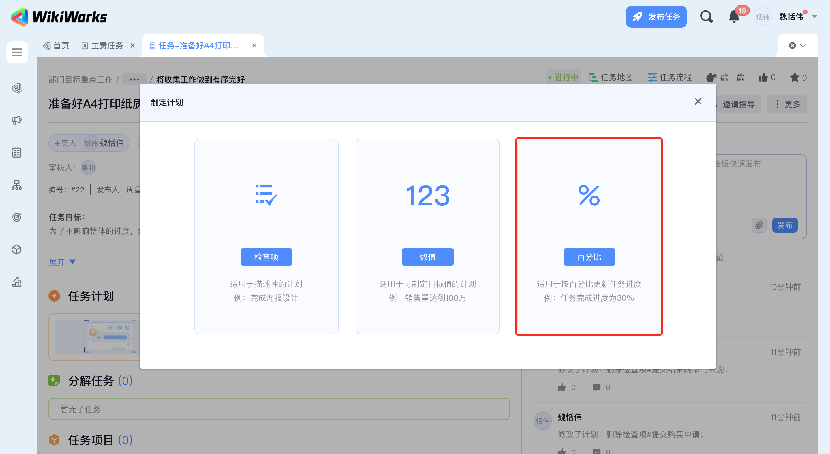 企业中不可量化的任务在做计划时可以选择百分比。点击「制定成果」,选择百分比,输入成果名称。输入数值的内容,制定完成。在输入框内输入完成的进度,点击「确定」更新完成,该关键结果的完成百分比会随之变化。
