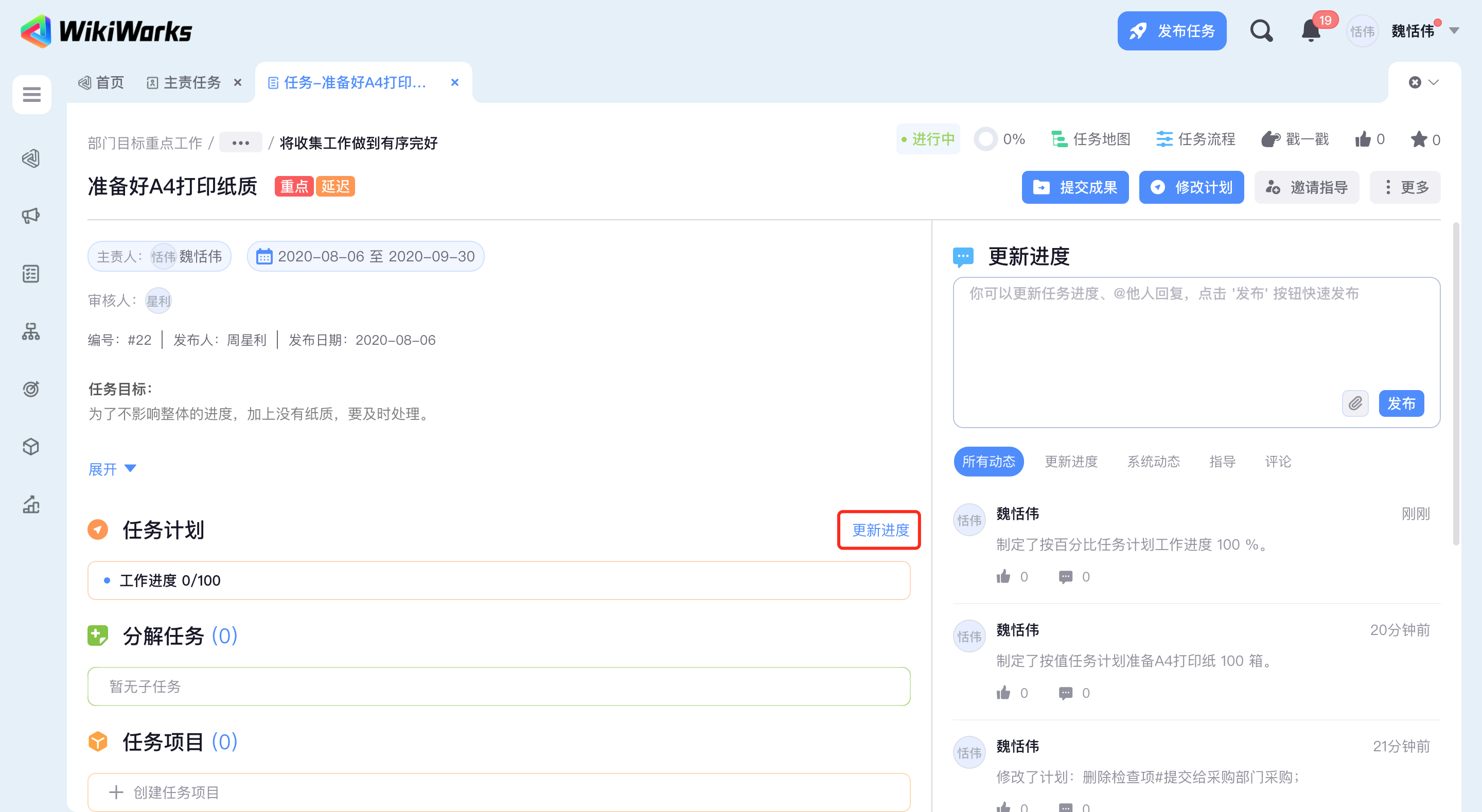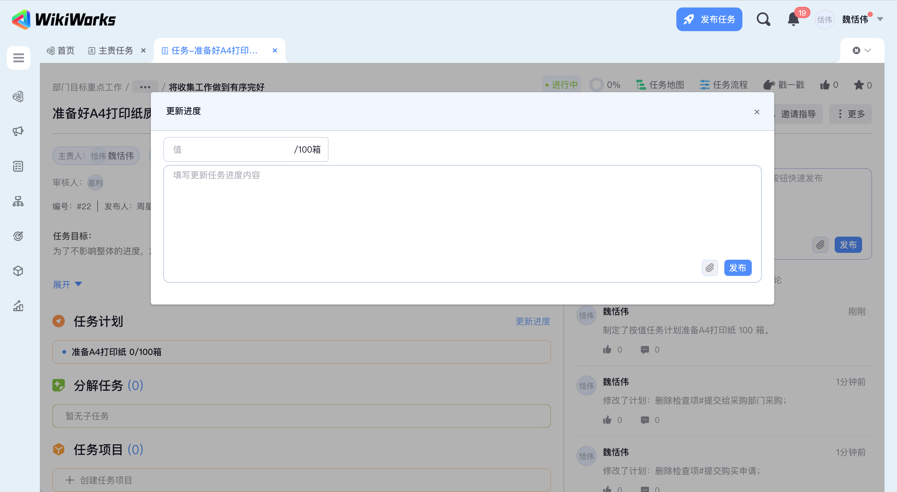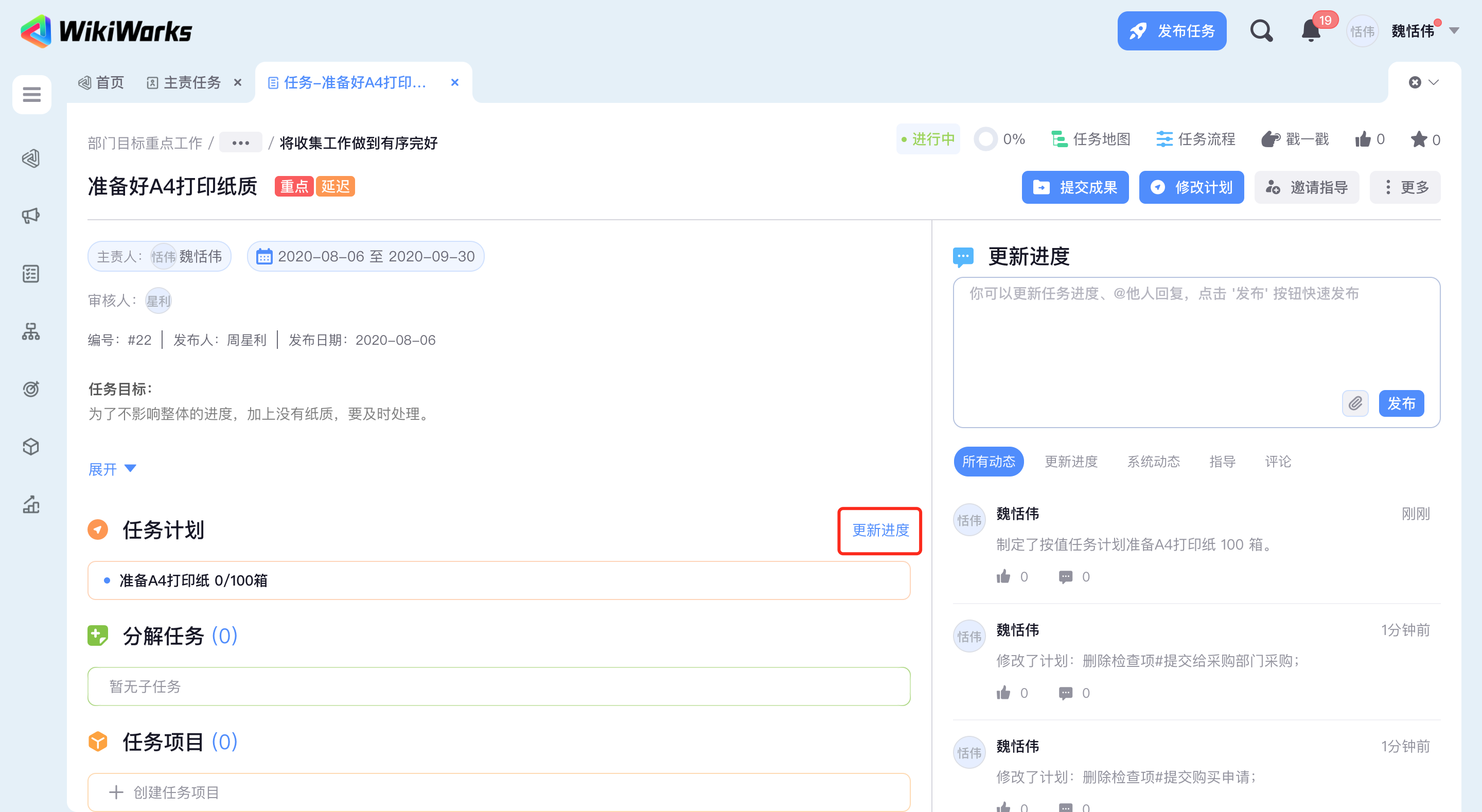 更新进度就是对个人对行为及阶段性提交成果给予高频、准确、具体、及时的记录,WikiWorks系统向来倡导这种以目标结果为导向来衡量日常工作中所有的“结果”和“行为”。