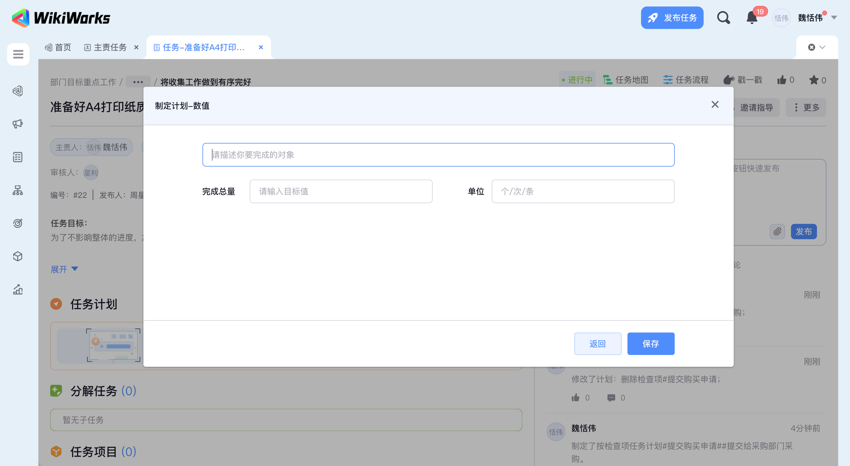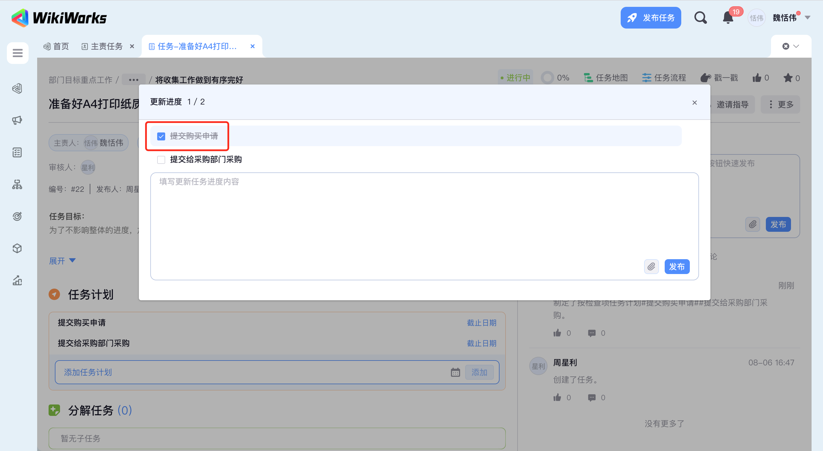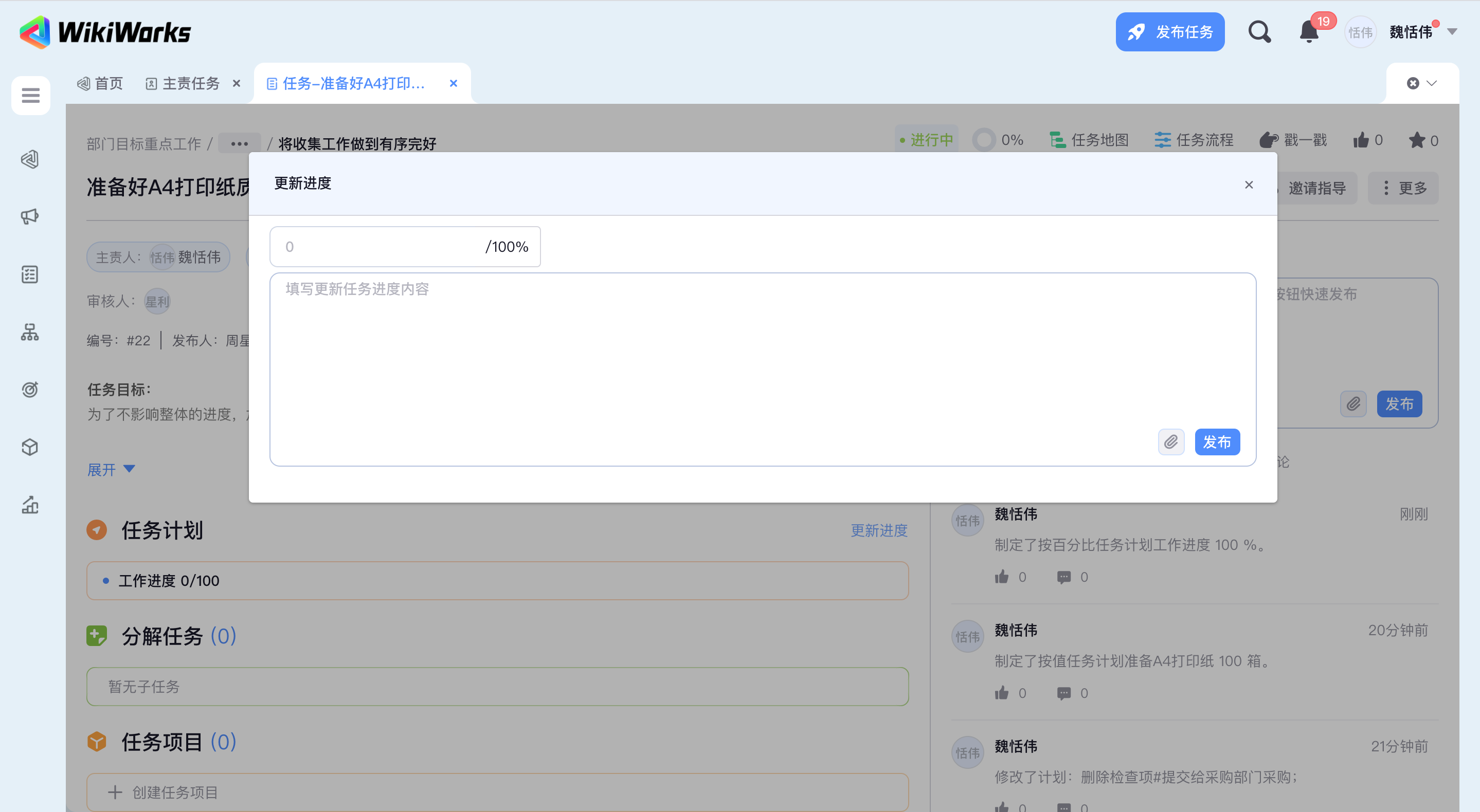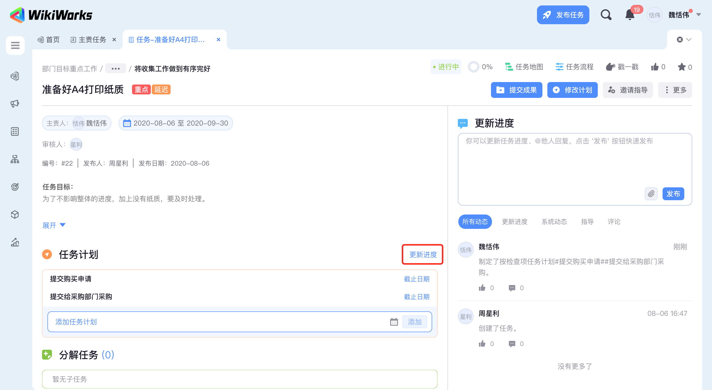 更新进度就是对个人对行为及阶段性提交成果给予高频、准确、具体、及时的记录,WikiWorks系统向来倡导这种以目标结果为导向来衡量日常工作中所有的“结果”和“行为”。