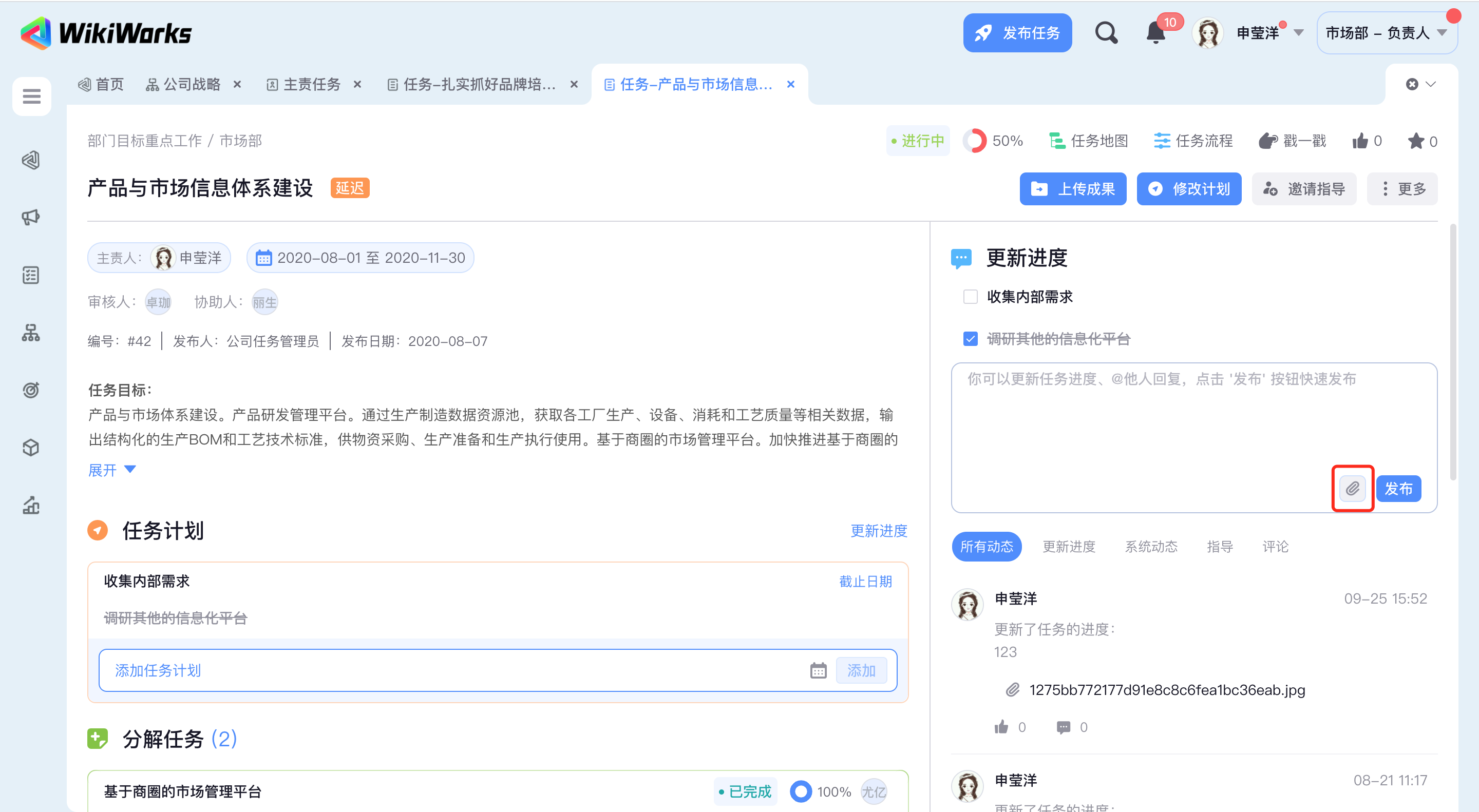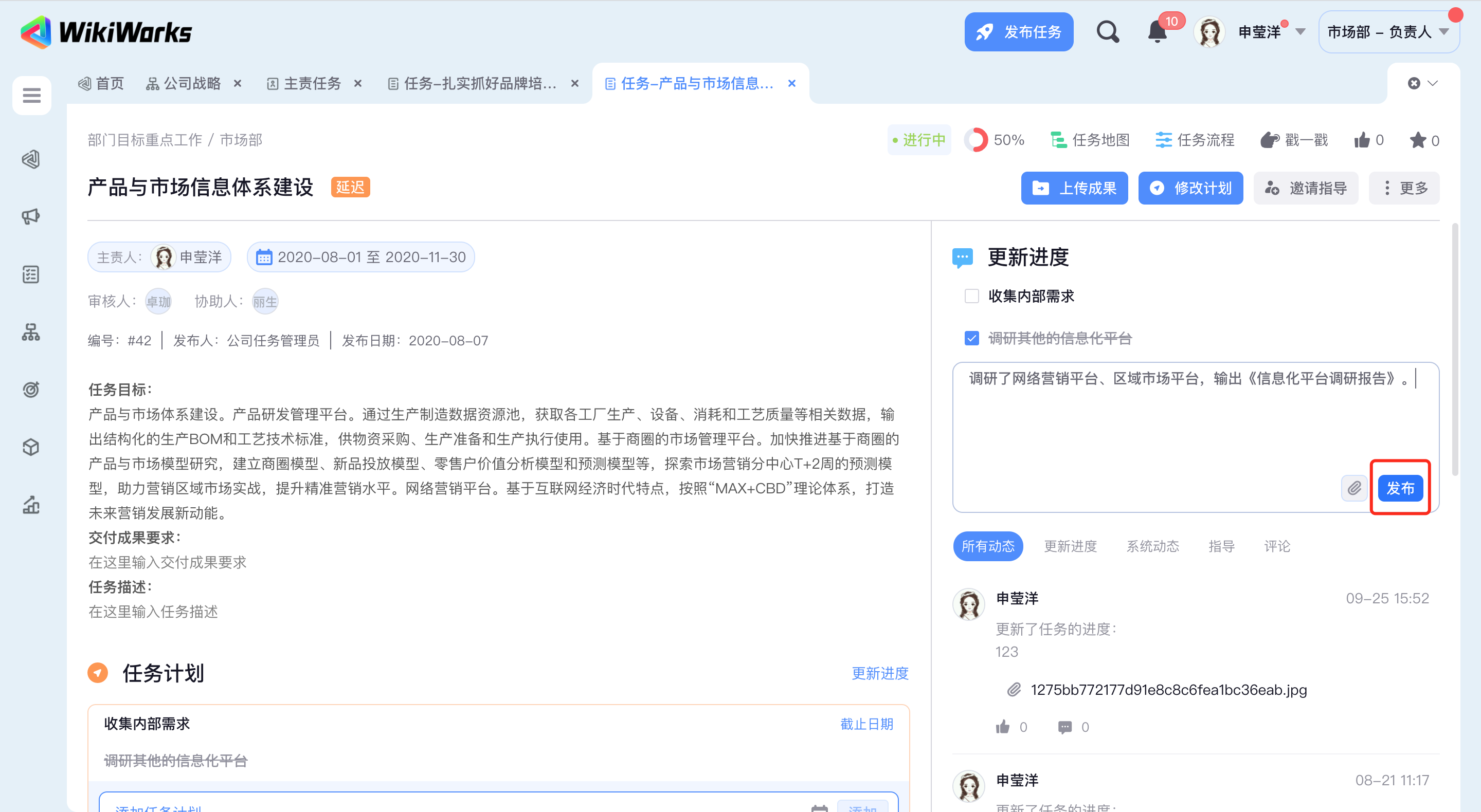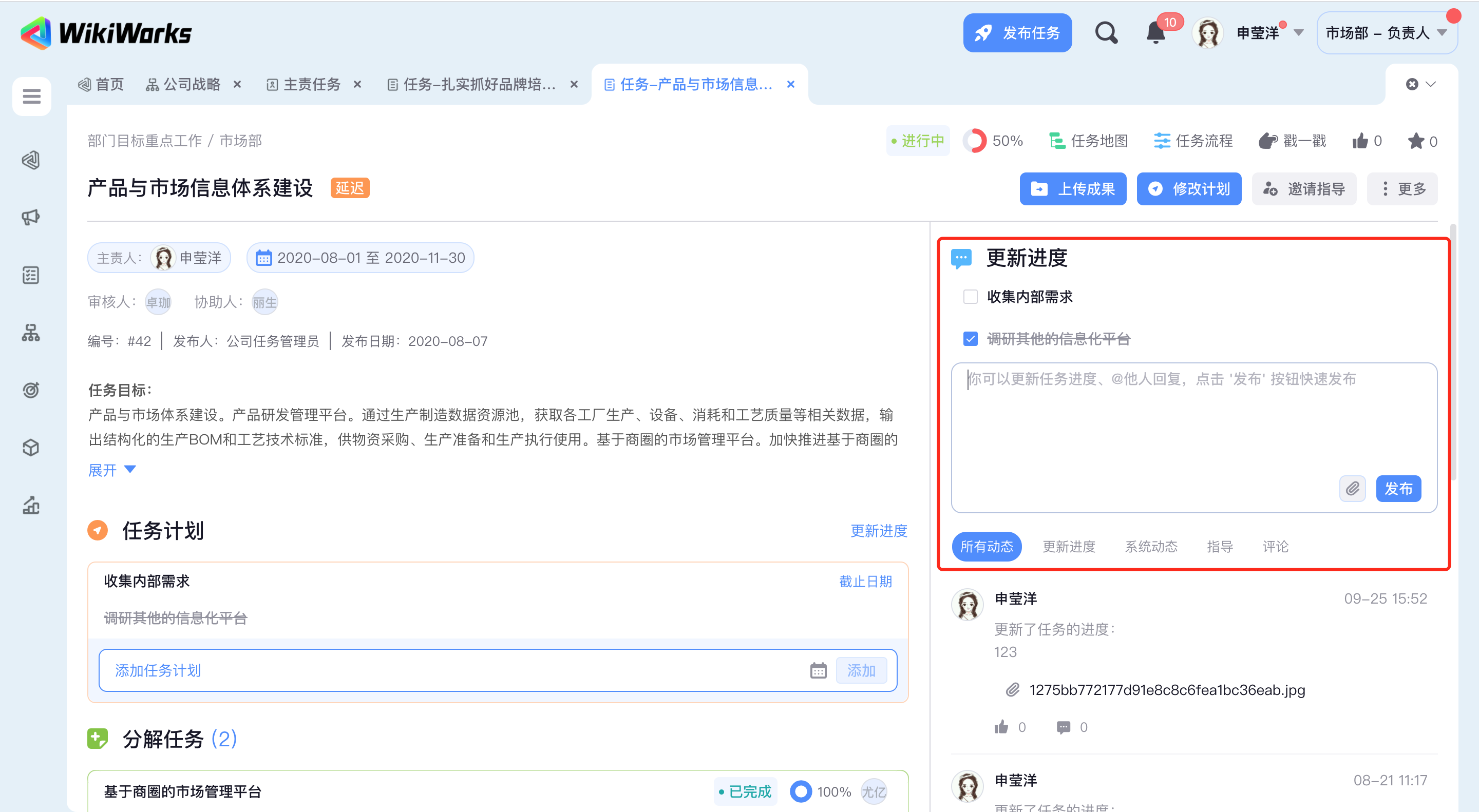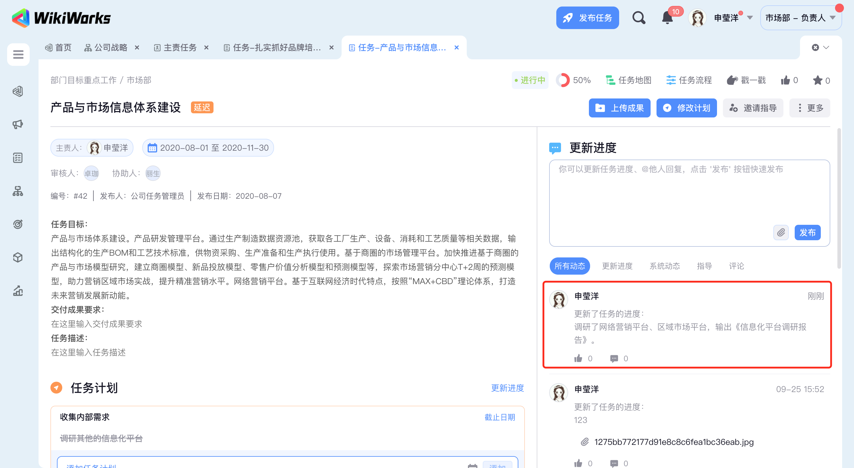 更新进度就是对个人对行为及阶段性提交成果给予高频、准确、具体、及时的记录,WikiWorks系统向来倡导这种以目标结果为导向来衡量日常工作中所有的“结果”和“行为”。