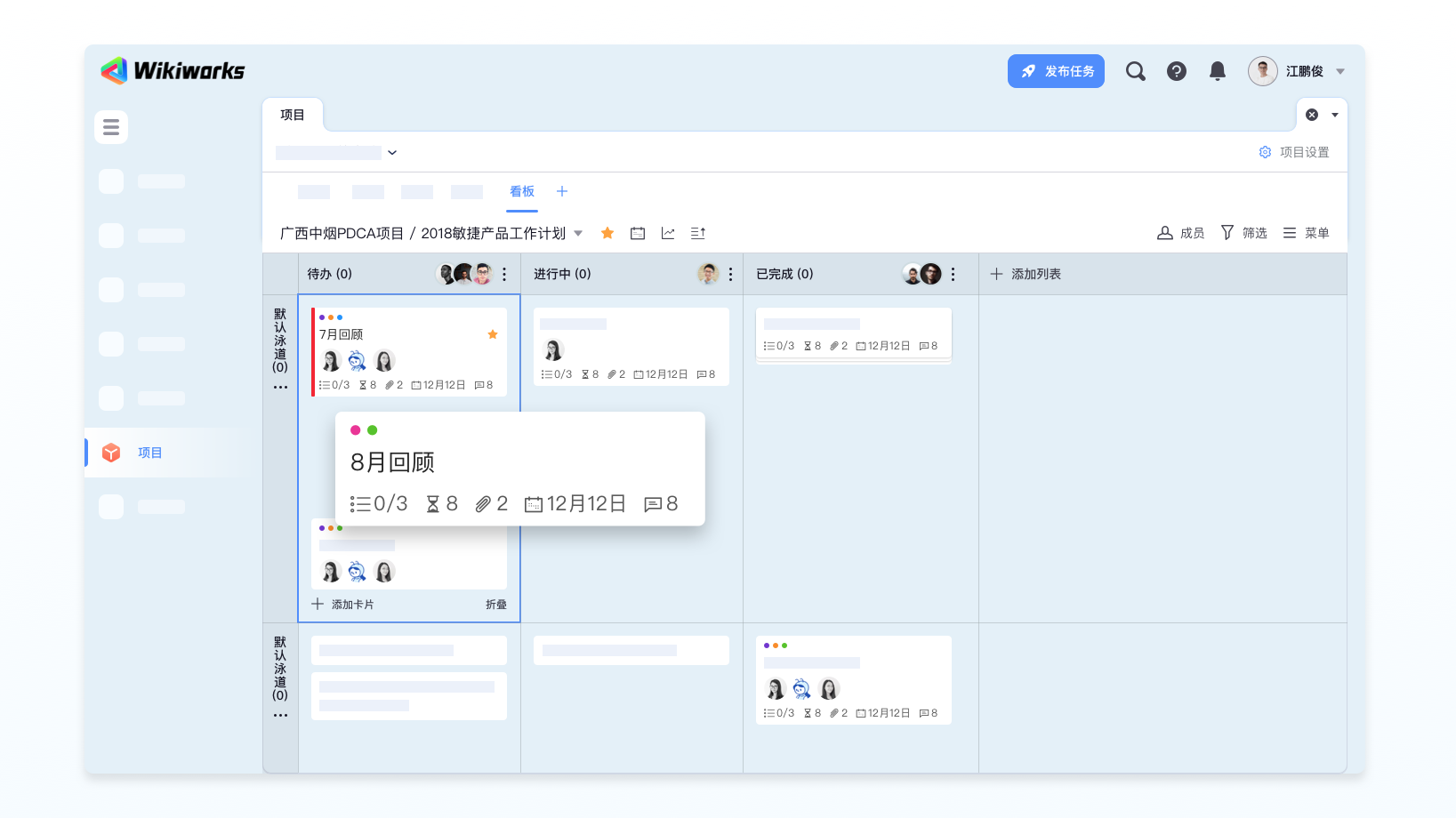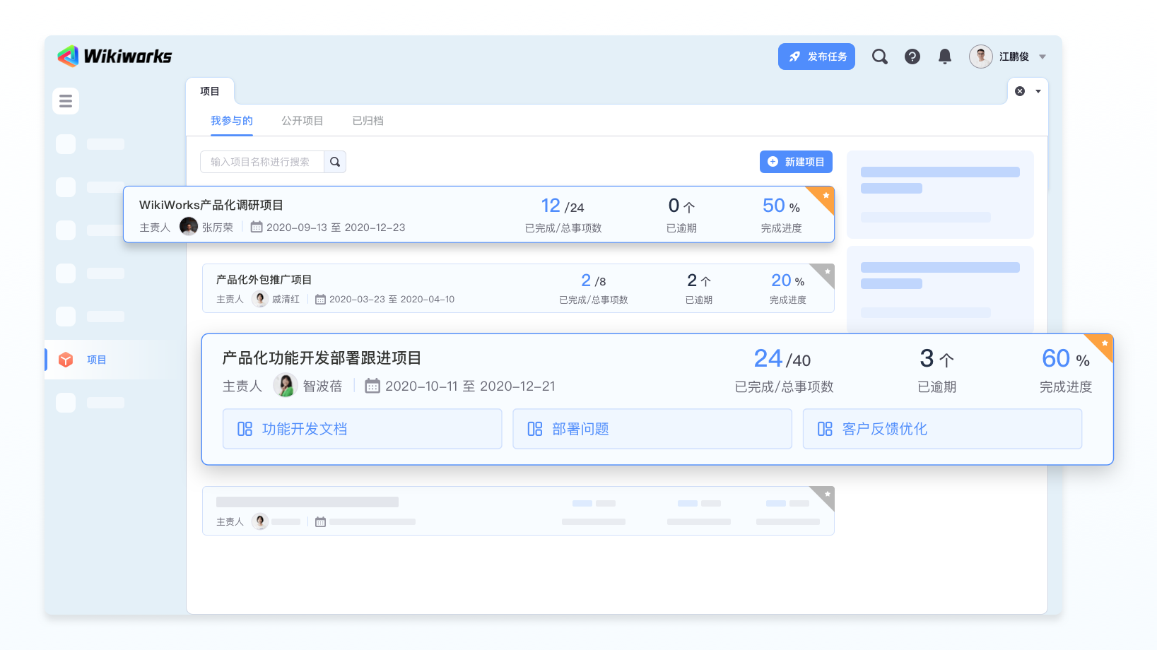在WikiWorks中,项目是公司重点任务执行的重要方式之一,包含了事项、资料、统计、动态、看板等工具,能够有效地支撑团队进行统筹规划、归纳整理以及综合调度资源,不断交付有价值的工作成果;也可以协助员工整理和记录个人事务。