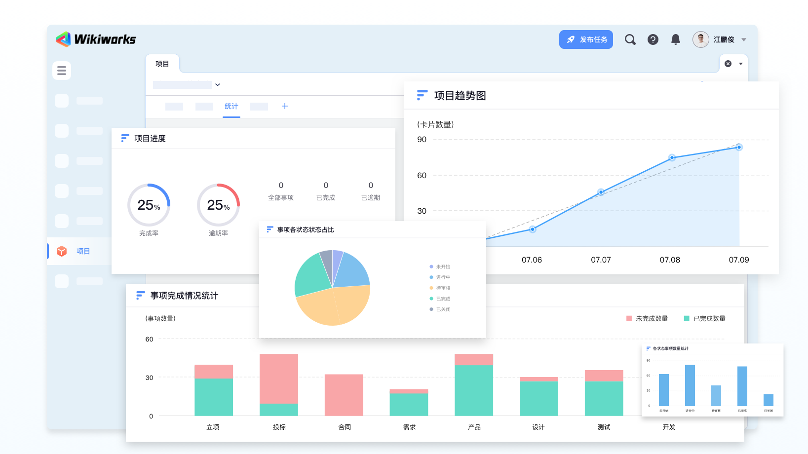 项目支持多维度数据汇总和统计,同时可支持项目进度、完成趋势、事项完成情况等多种可视化的视图展示,方便管理者直观了解任务的数据情况。