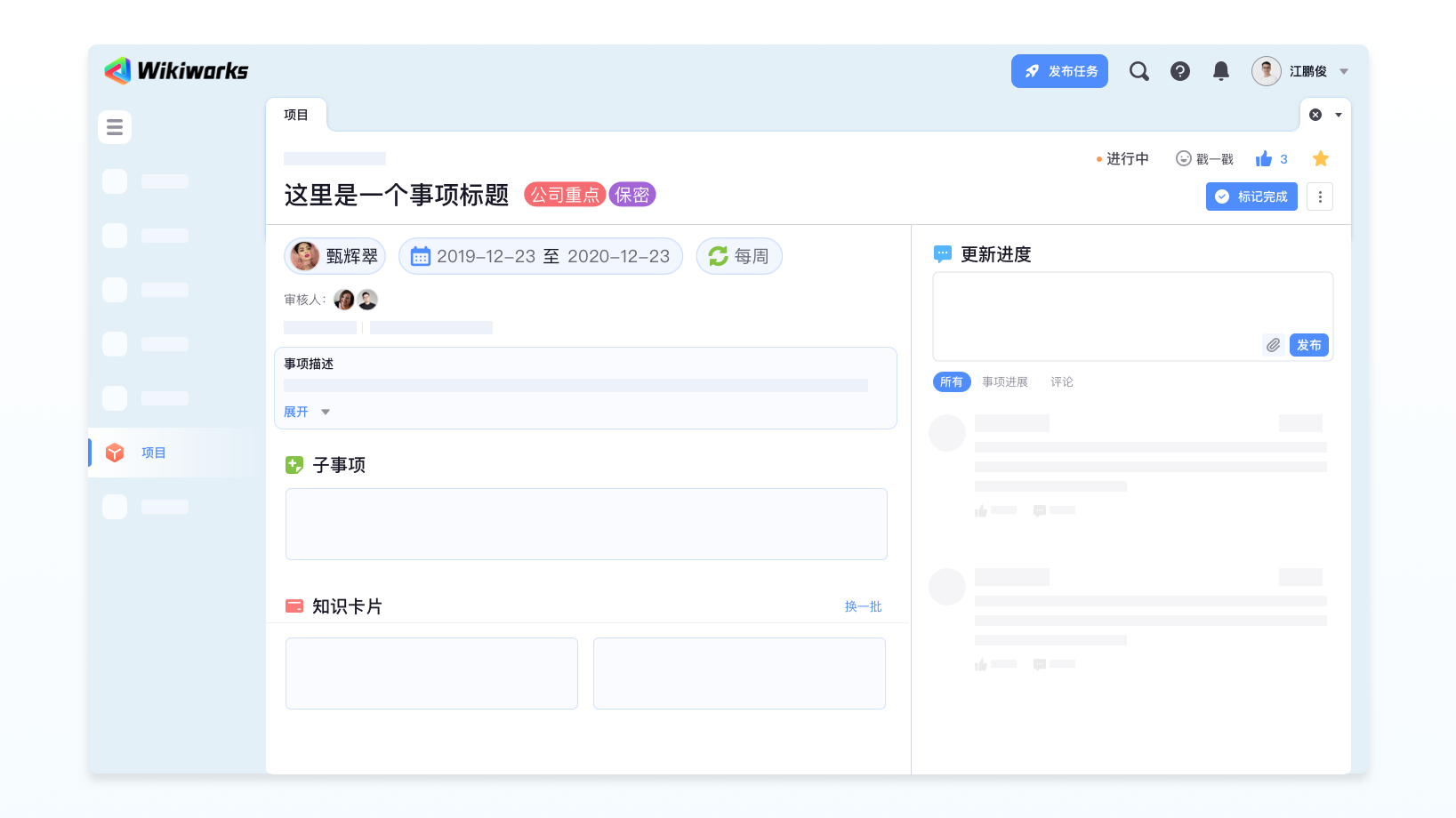 事项是 WikiWorks 中一个非常重要的信息载体,事项的详情页展示了事项的详细信息:主责人、审核人、时间、事项描述、子事项、知识卡片以及进展、评论、动态等重要内容。