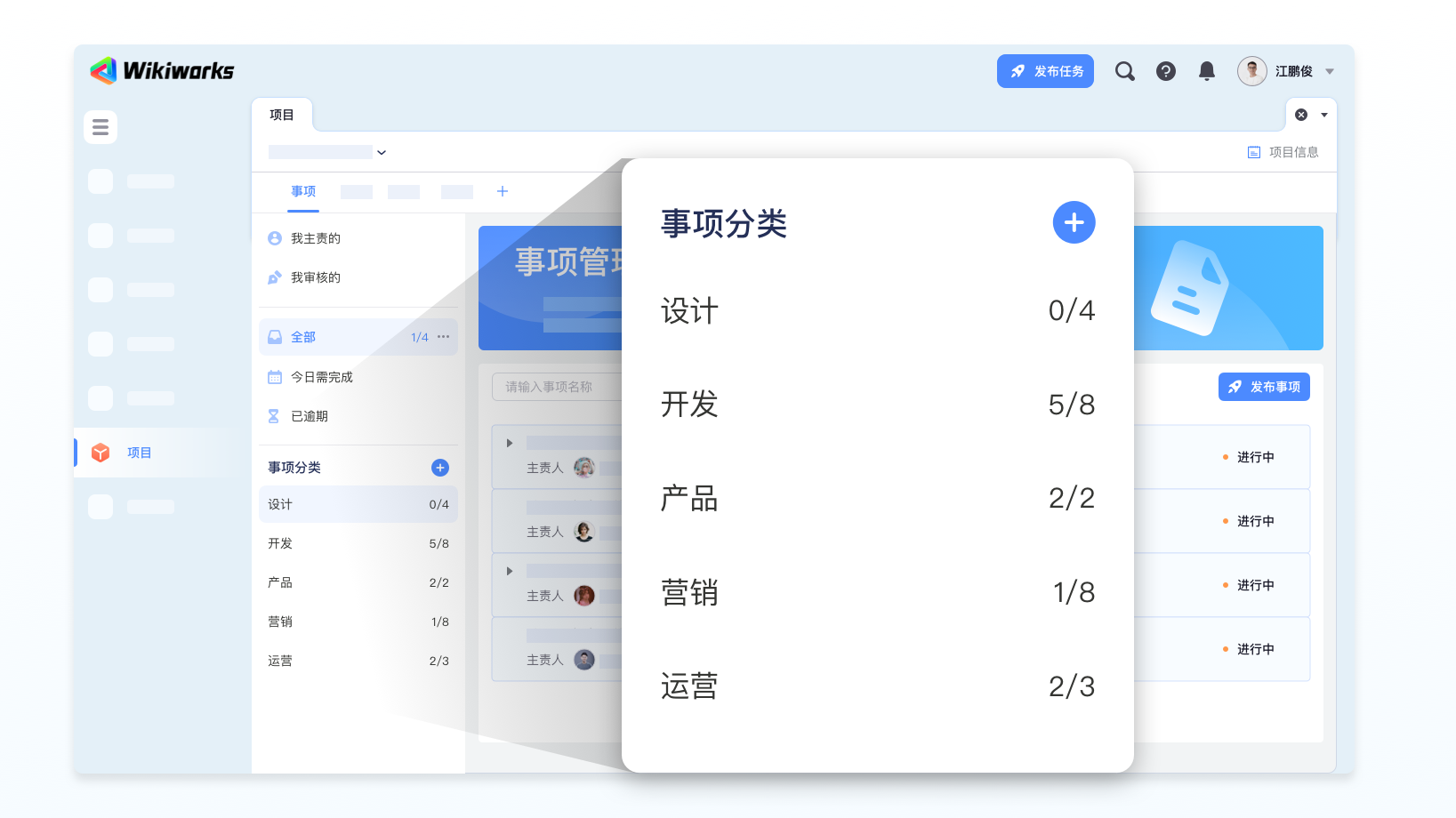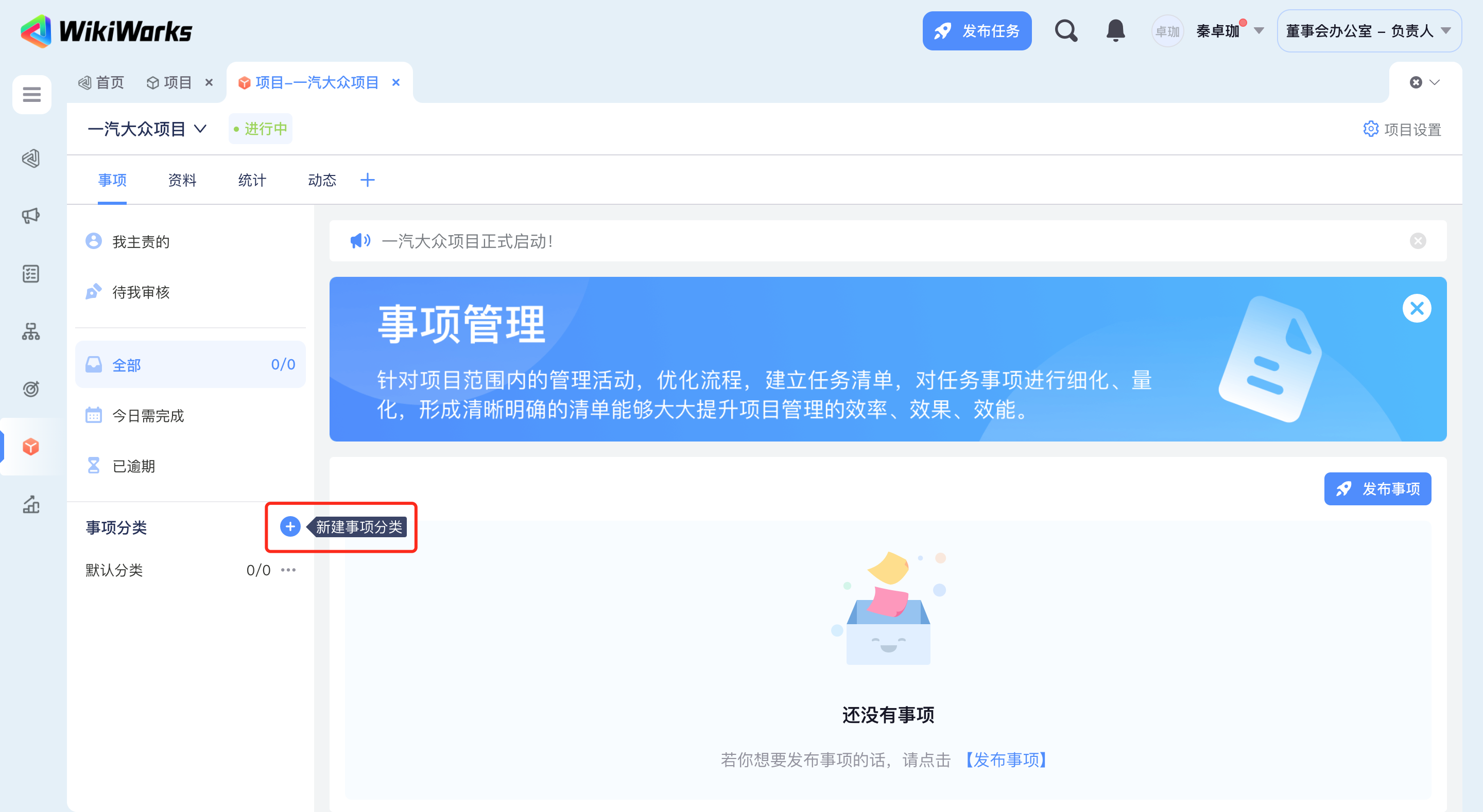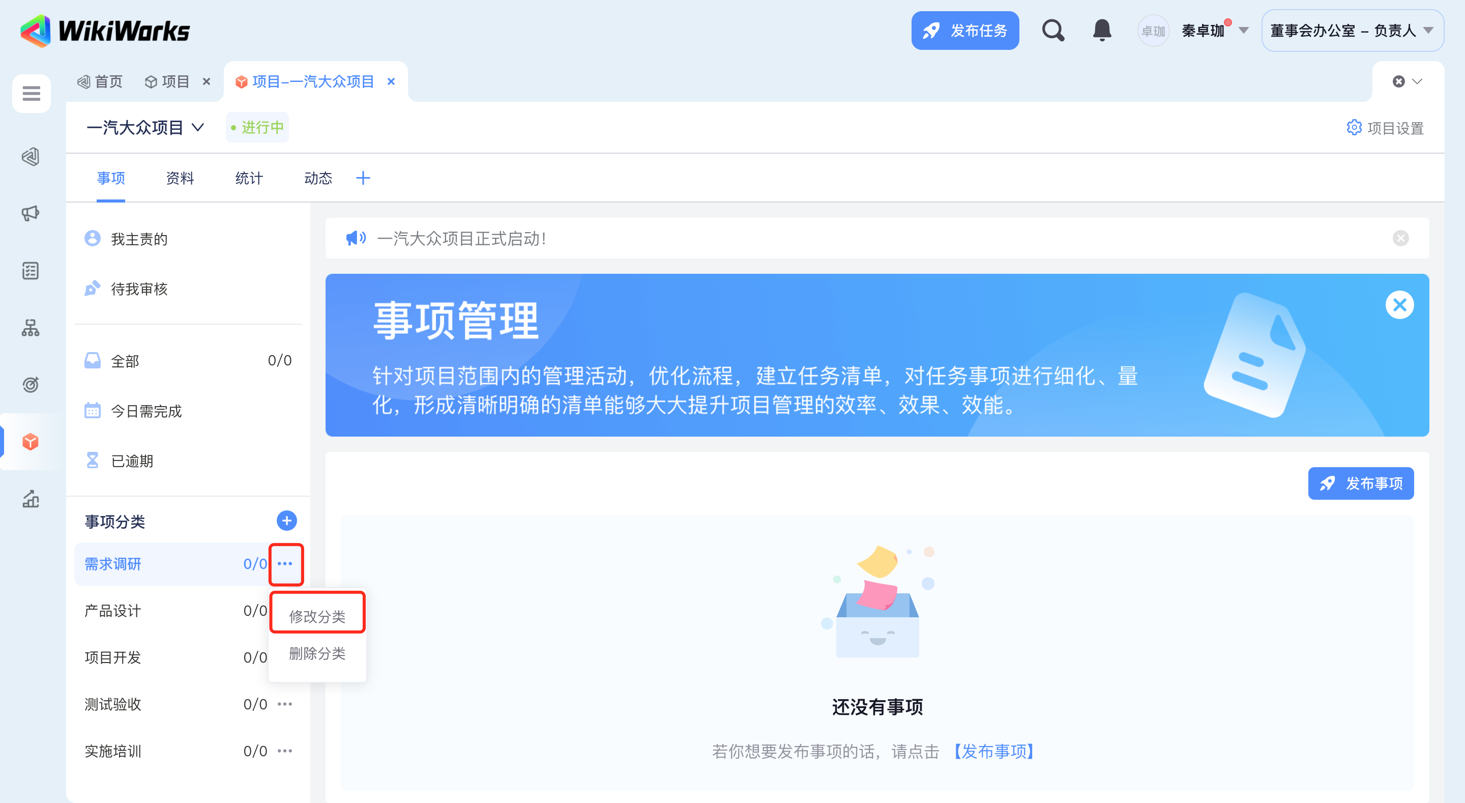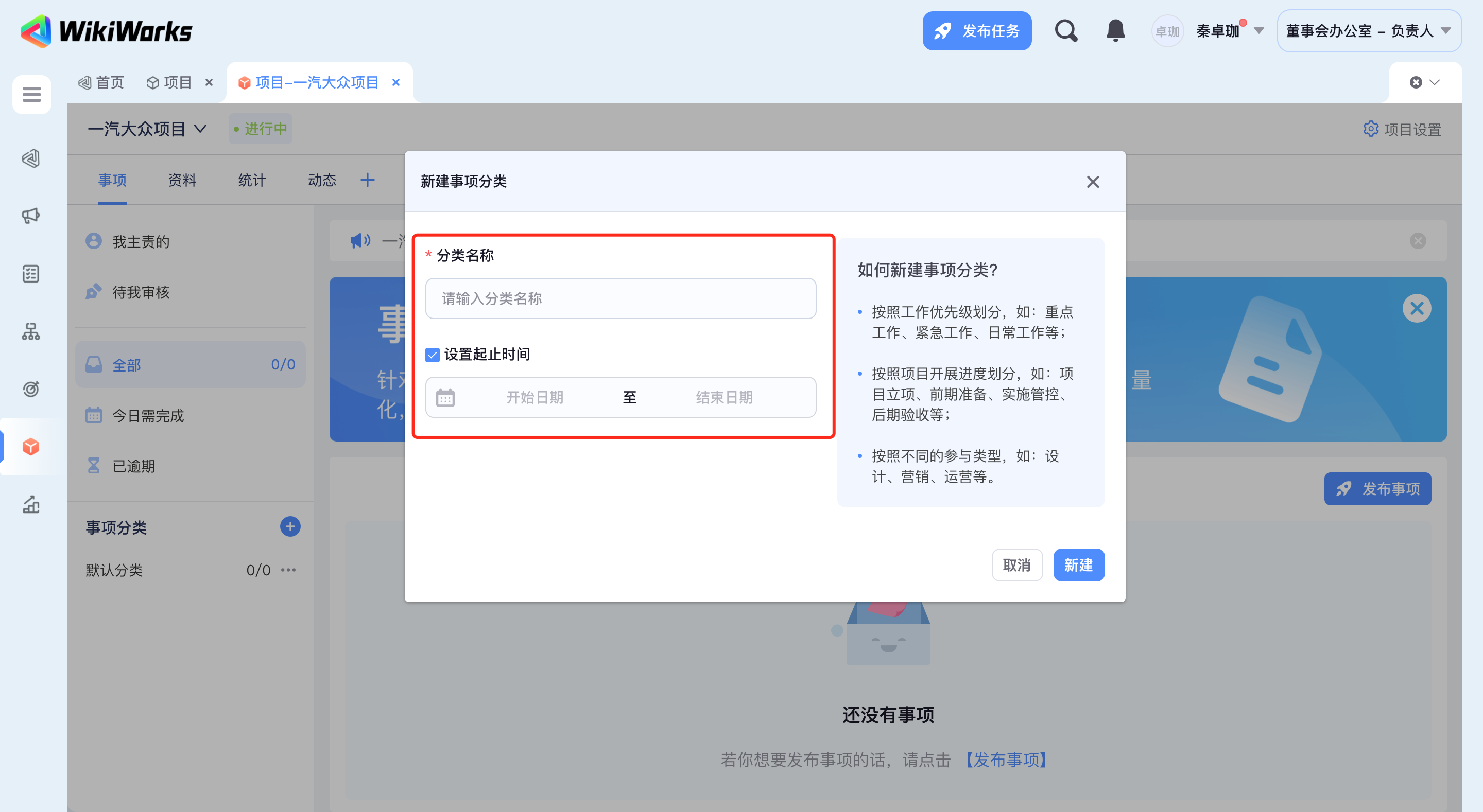 进入项目-事项页面后,点击事项分类的「添加」按钮,输入分类名称,选择起止时间,点击「创建」。2.修改分类