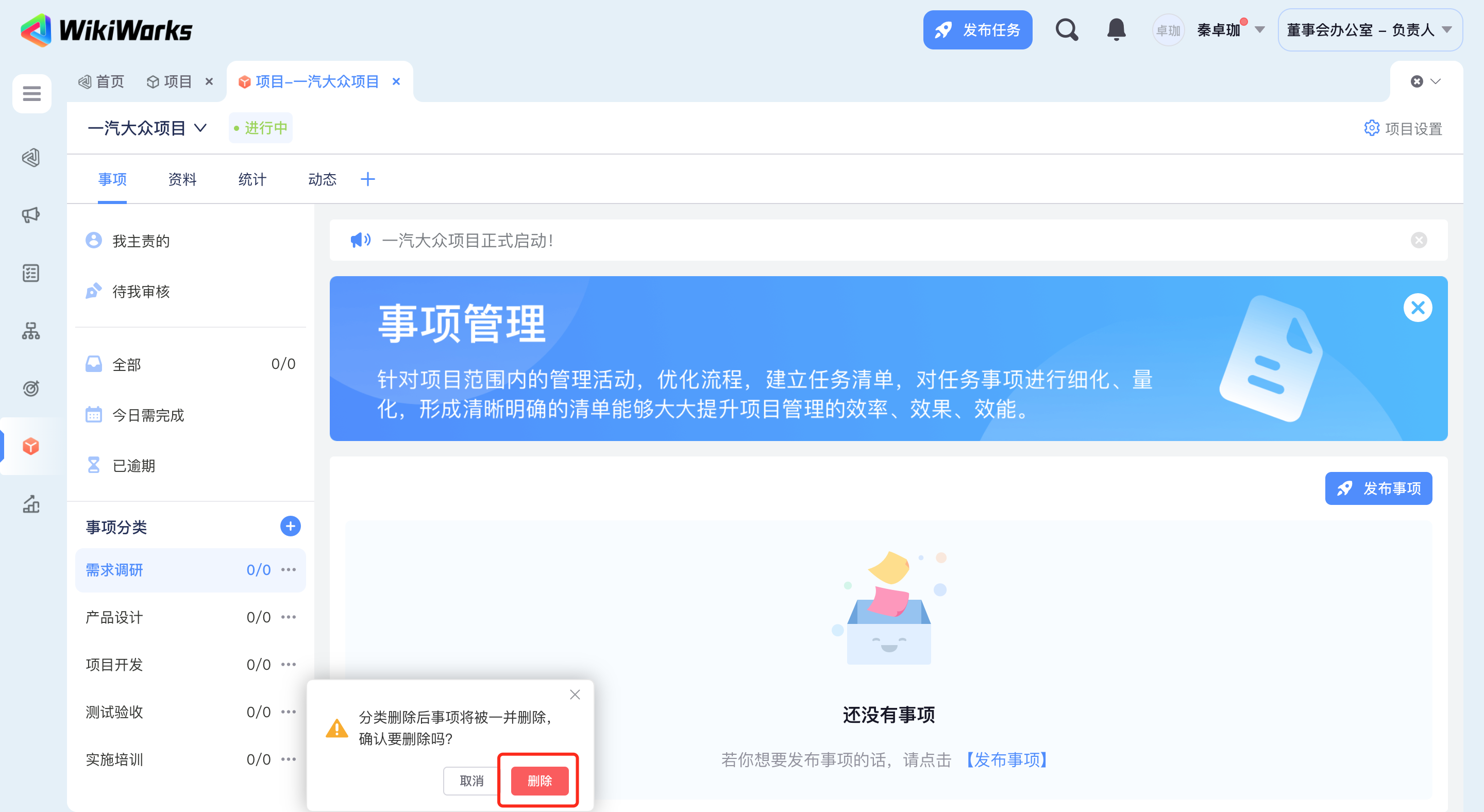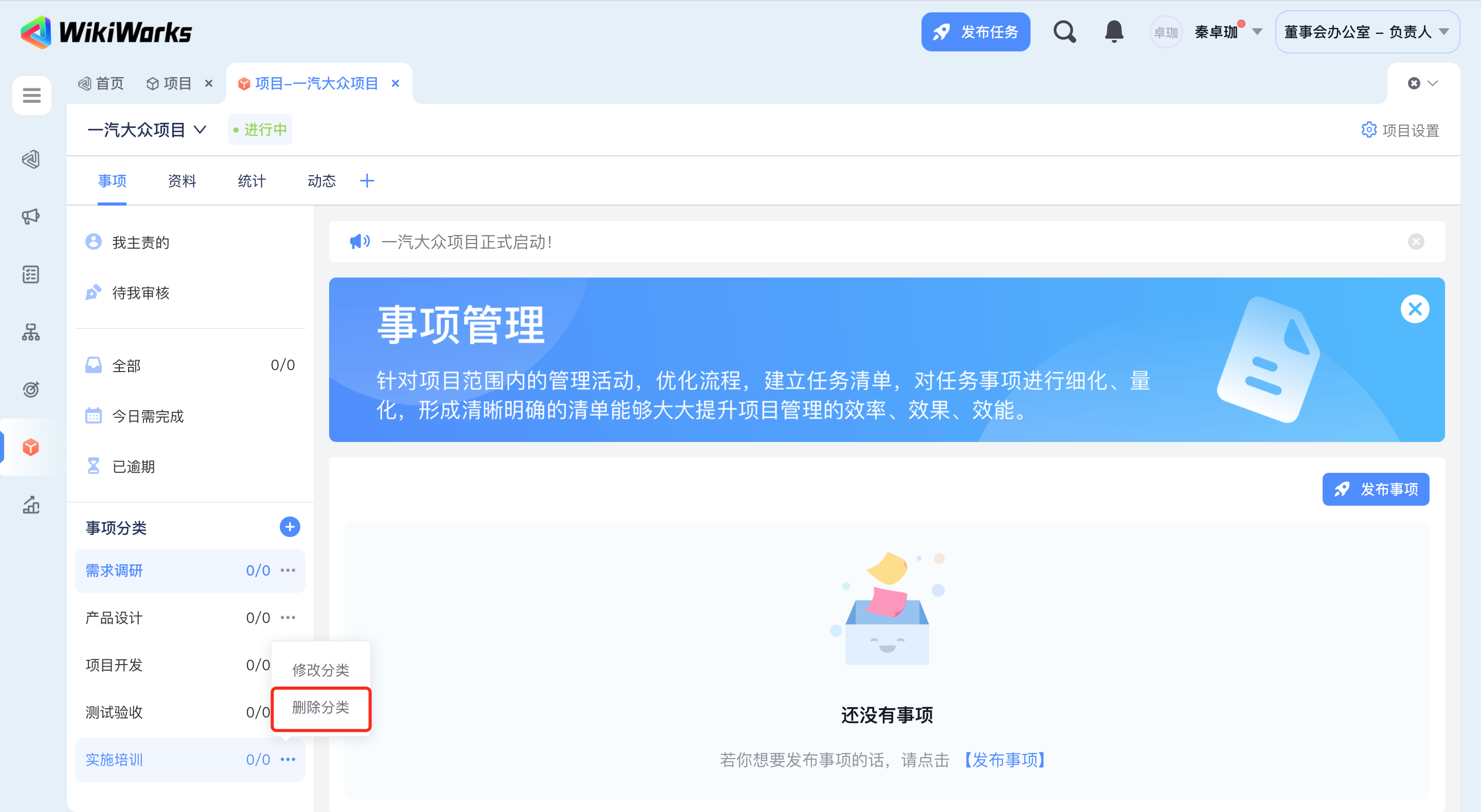 当鼠标悬浮到事项分类「更多」按钮时,点击「删除分类」再次确认后,删除成功。