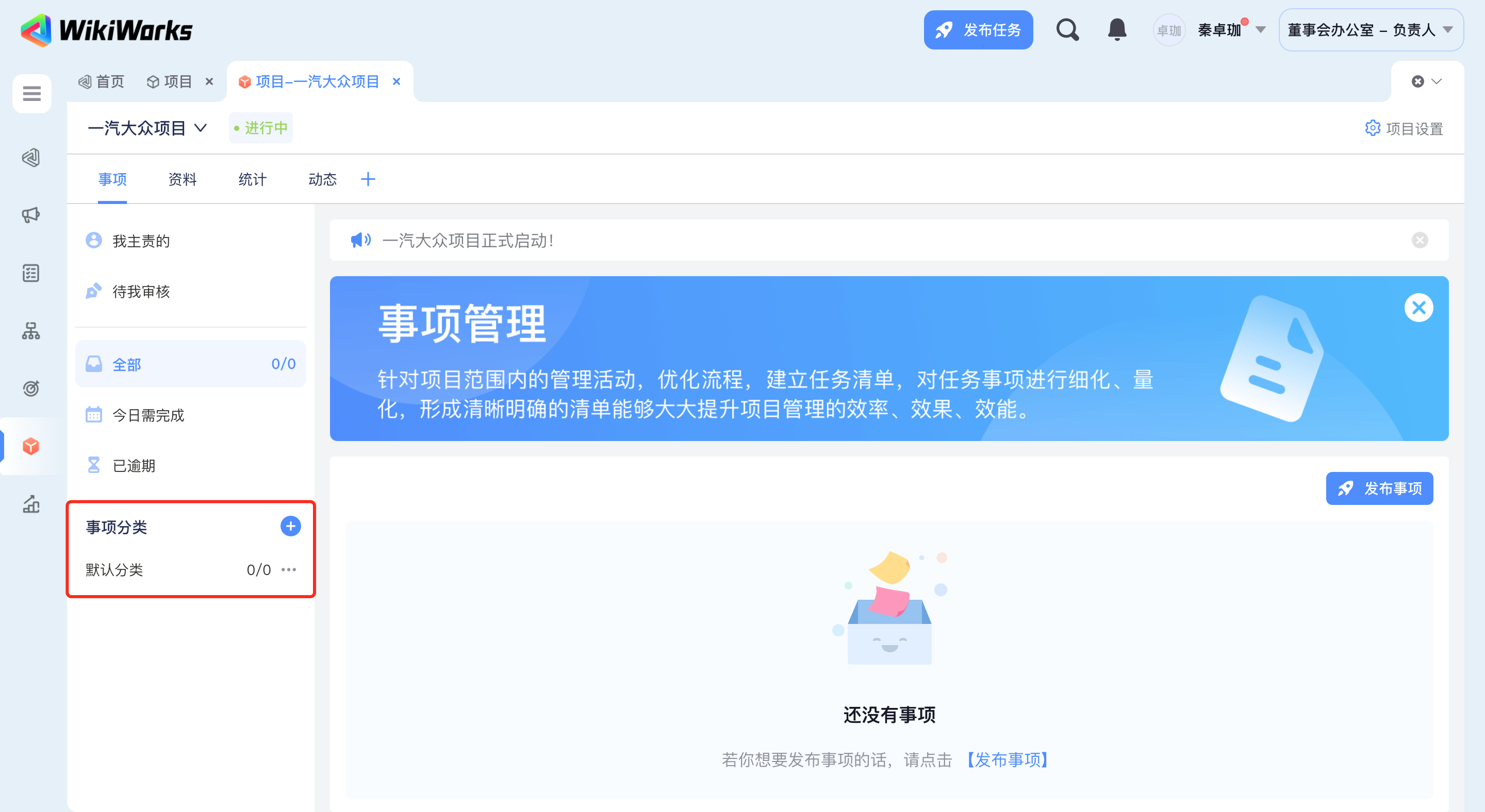 事项的分类在事项主页中左侧部分,支持创建、修改和删除。1.创建分类