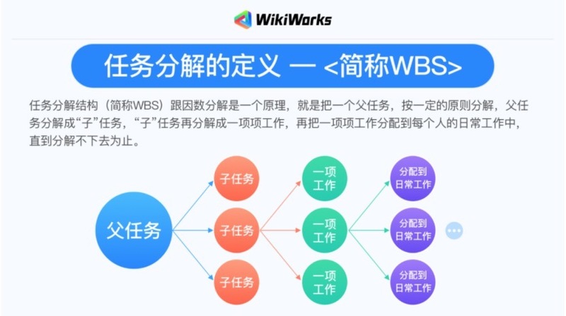 分解是一种把目标范围和任务可交付成果逐步划分为更小、更便于管理的组成部分的技术。在WikiWorks的目标管理中,分解主要指的是WBS(工作分解结构)的方面,主要可用于两种情况: